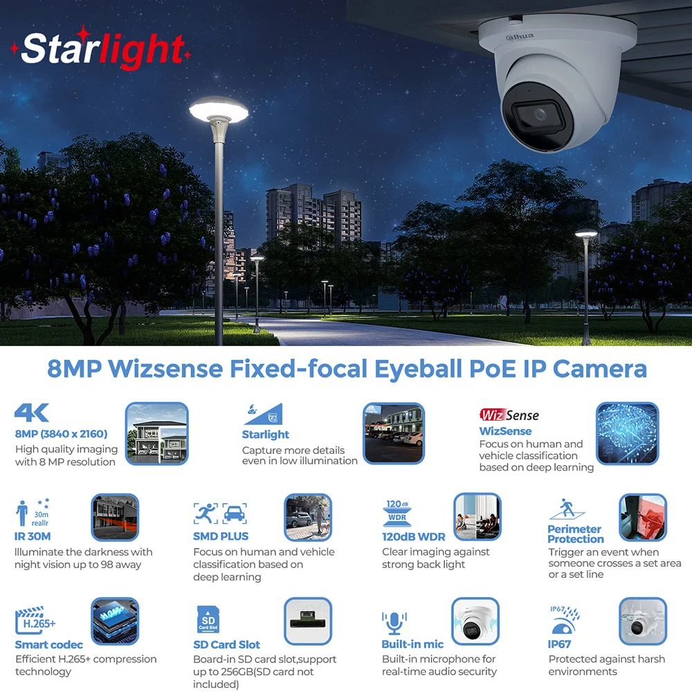> H.265 codec, high compression rate, ultra-low bit rate. · Built-in IR LED, and the max. illumination distance is 30 m.Â