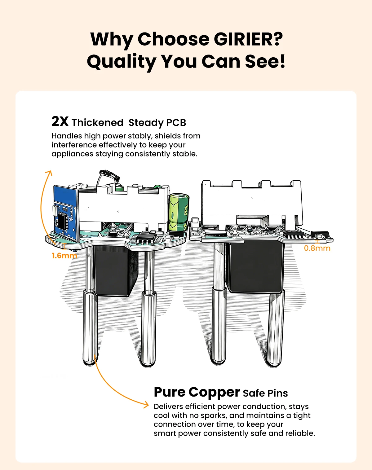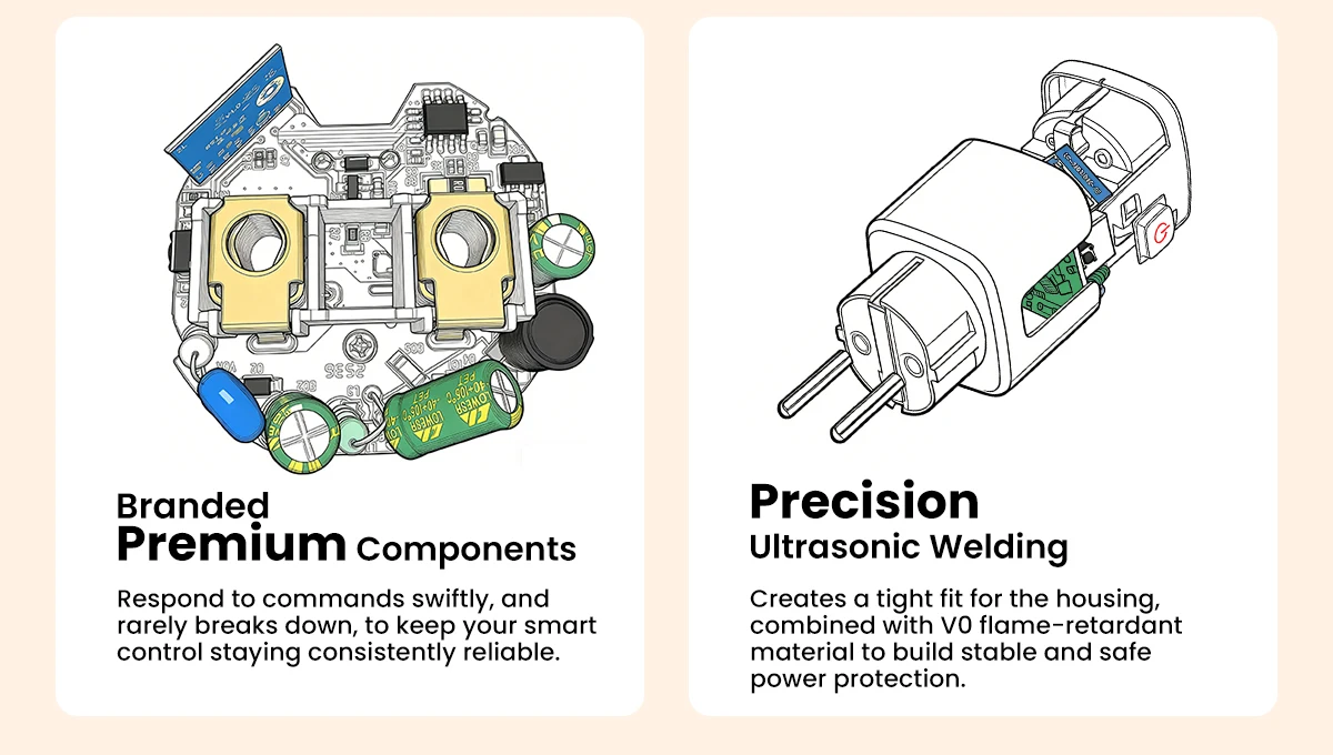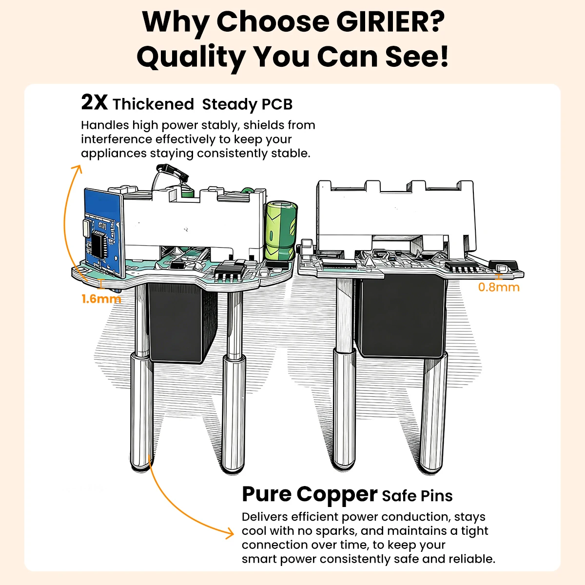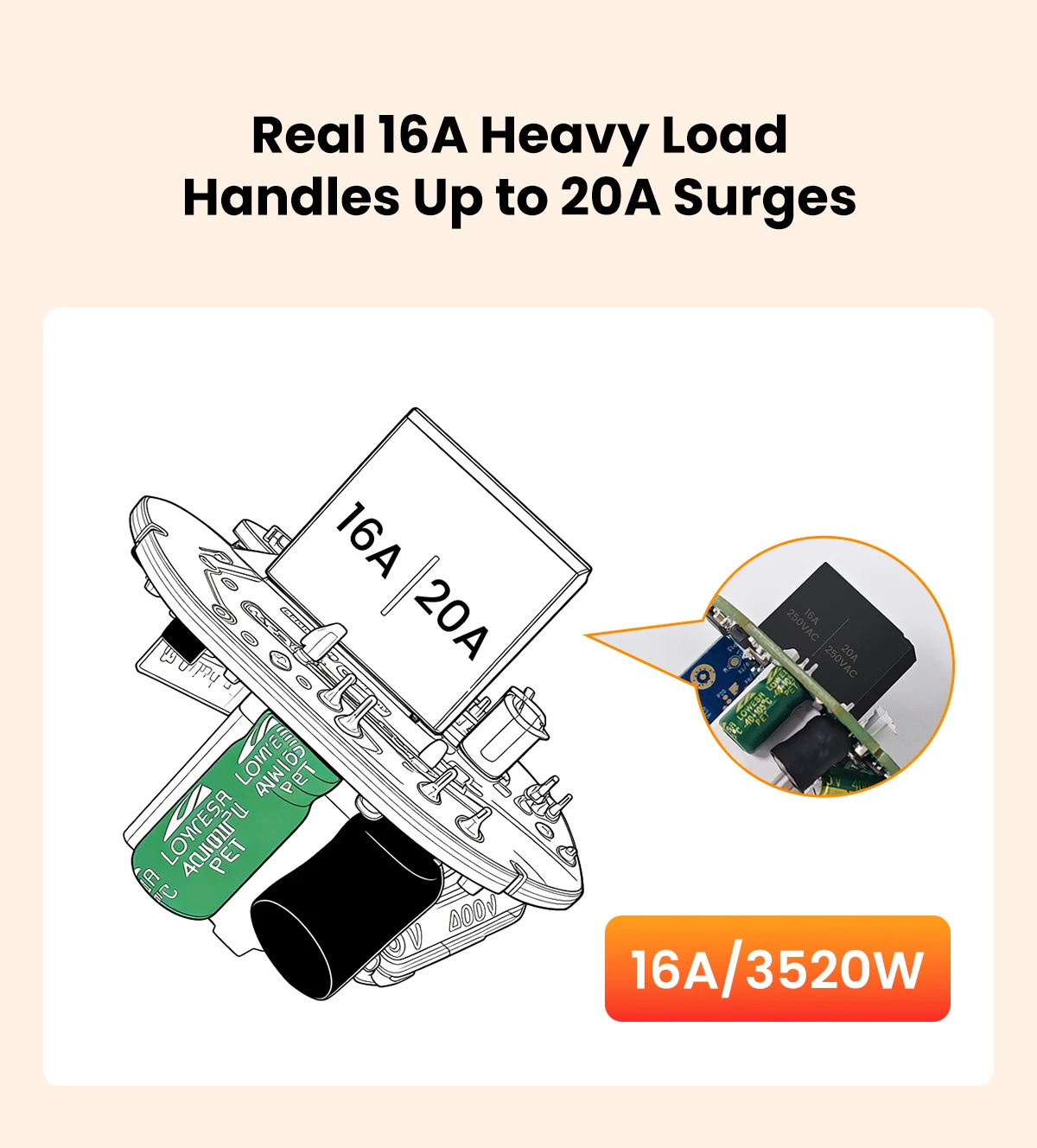 It features a 2x thickened steady pcb, pure copper safe pins, and branded premium components, while its housing is crafted with precision ultrasonic welding and v0 flame-retardant material, supporting a 16a stable load and up to 20a surge capacity for long-lasting reliability.